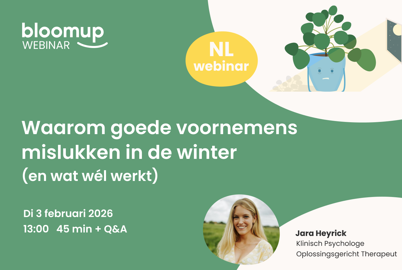 Je kent het wel: dat eindeloze malen over dingen die al gebeurd zijn of nog moeten komen. Het houdt je wakker en vreet energie. BloomUp leert je stil te staan bij wat écht telt, om te gaan met zorgen zonder dat ze je overnemen, en weer vertrouwen te krijgen in je eigen veerkracht. Zo komt er rust in je hoofd en energie vrij voor wat belangrijk is.