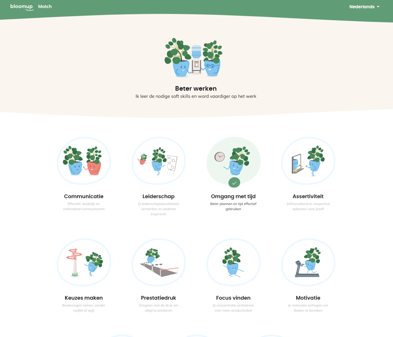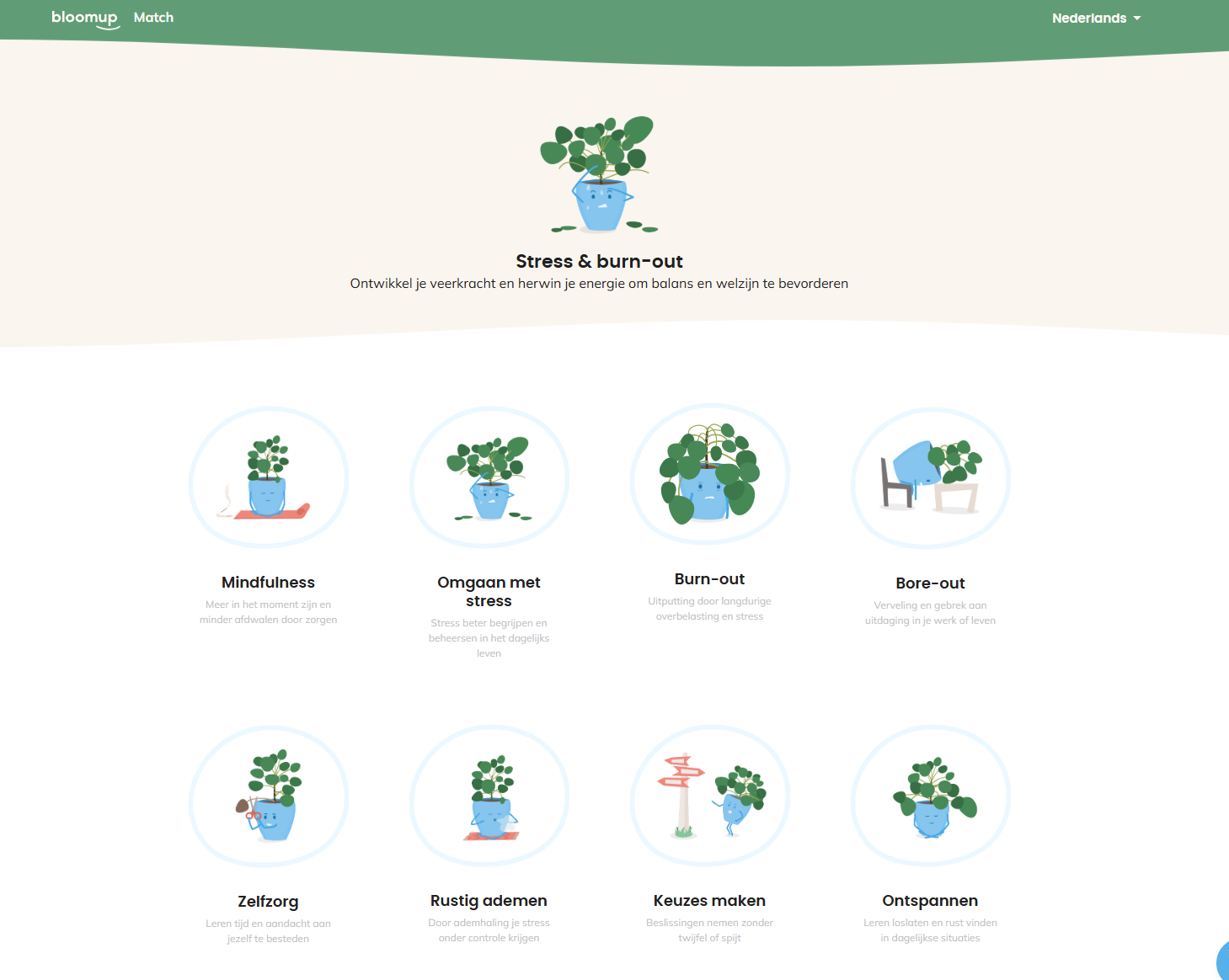 BloomUp becomes the central access point where every employee starts. The platform automatically refers to internal and external options, based on the challenge someone is experiencing or the growth they envision. In this way, the full wellness offering is better utilized, without additional complexity or communication.